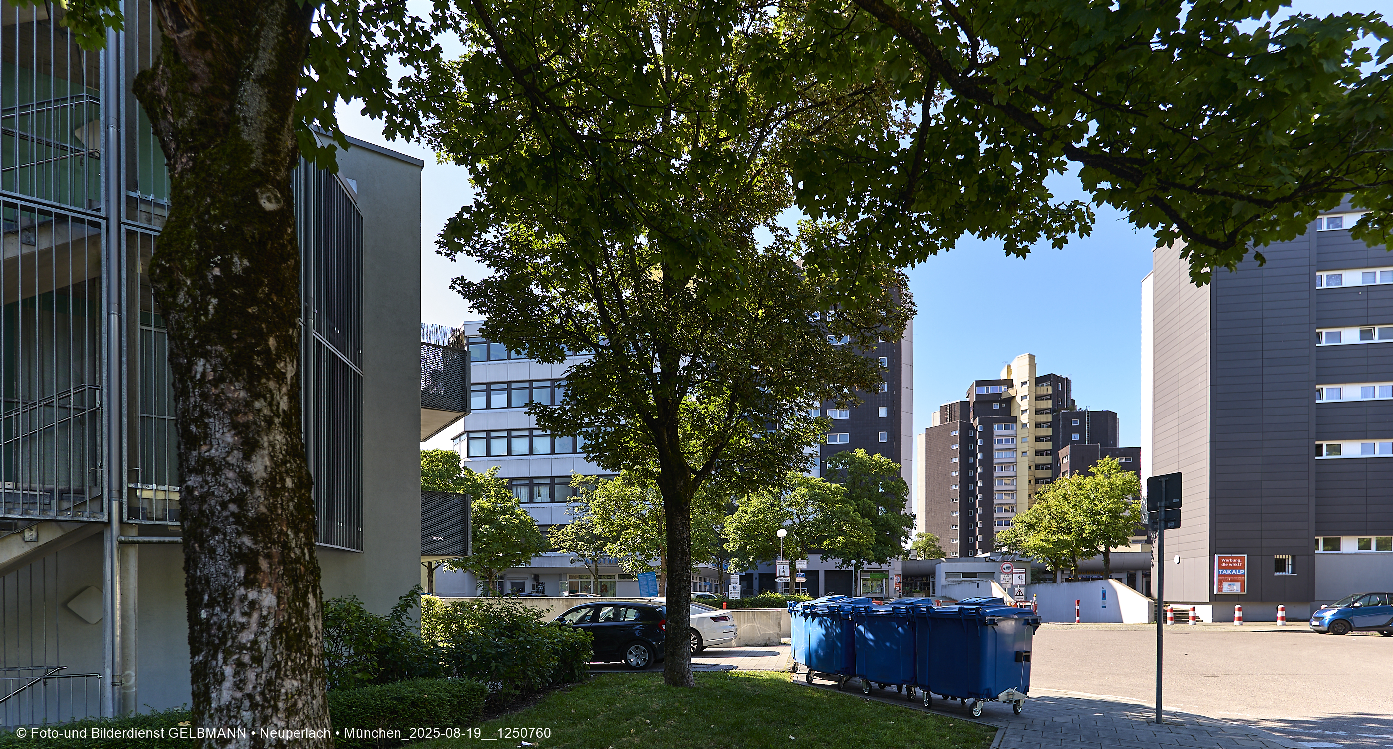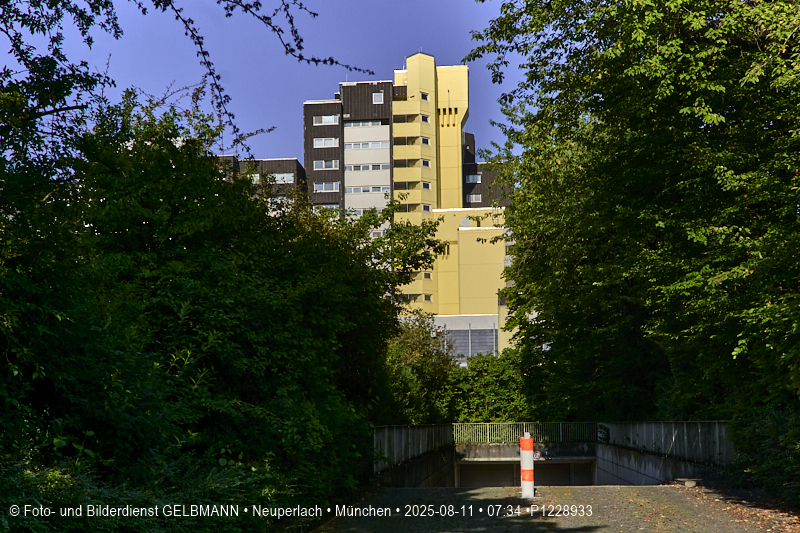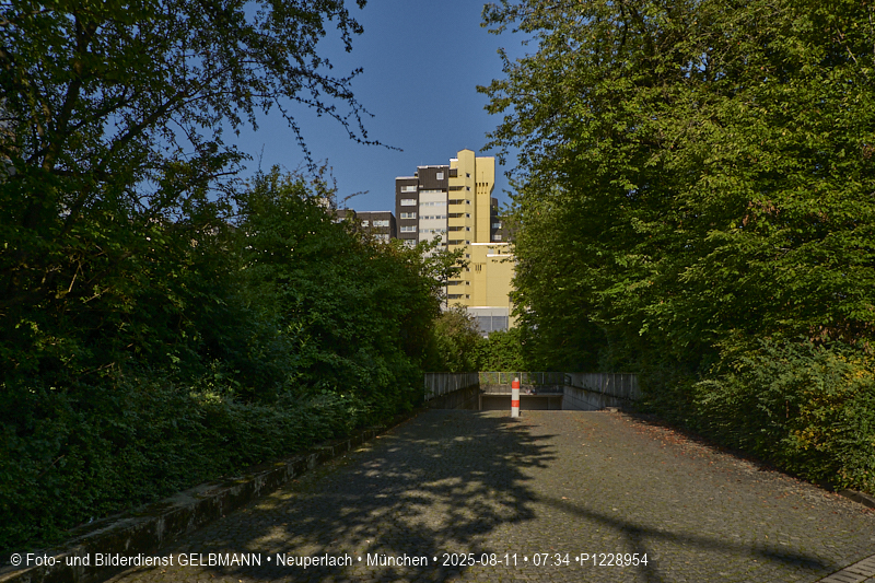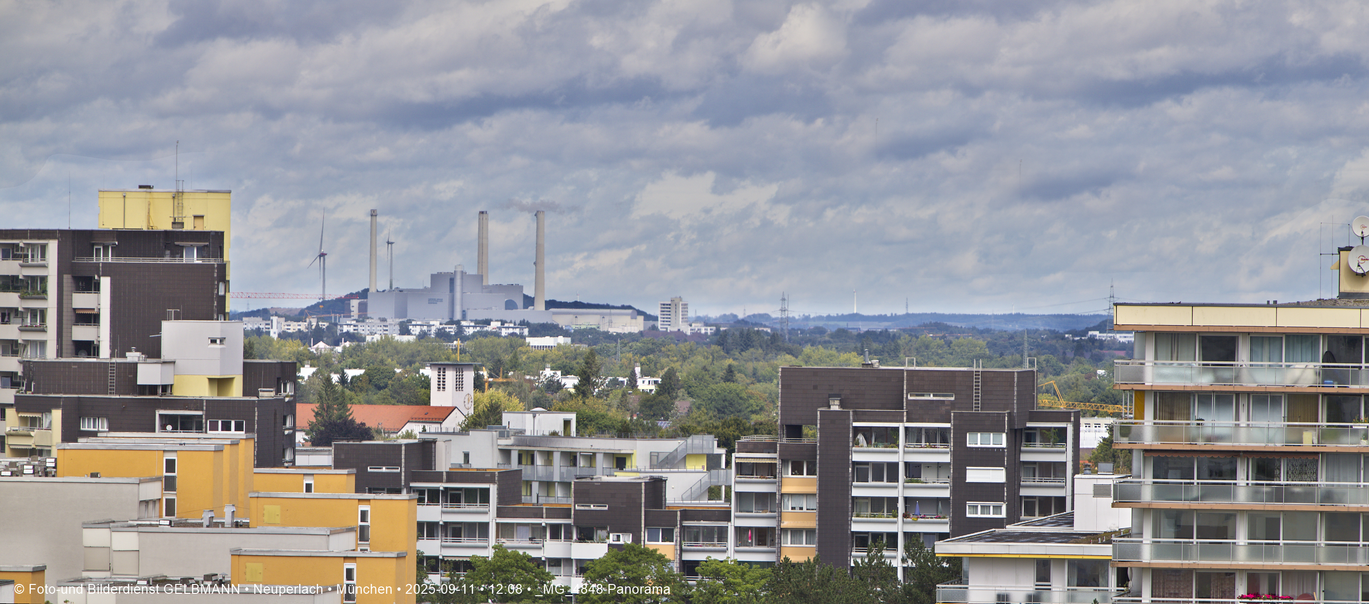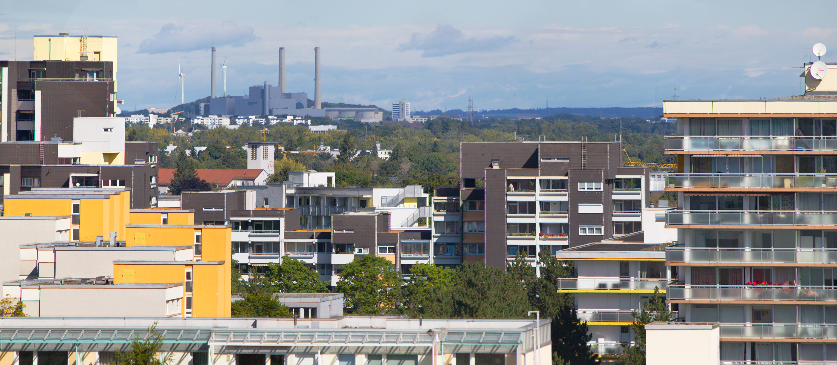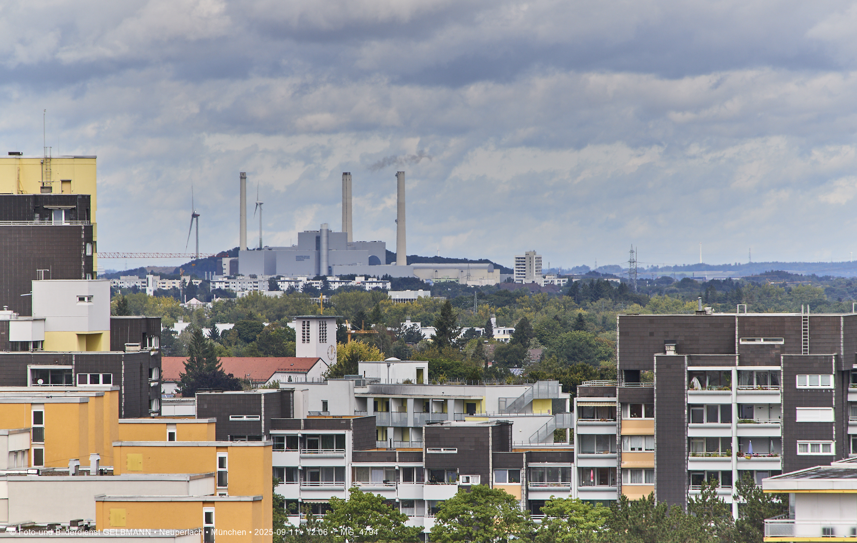 Der Blick kommt von Süden und geht inRichtung Norden. Über den Karl-Marx-Ring 58 hinweg zum Kraftwerk Nord in Unterföhring. Links davonbeginnt das Marx-Zentrum mit dem Peschelanger 7 und davon weiter links, das Gebäude des Max-Kolmsperger-Straße 19.