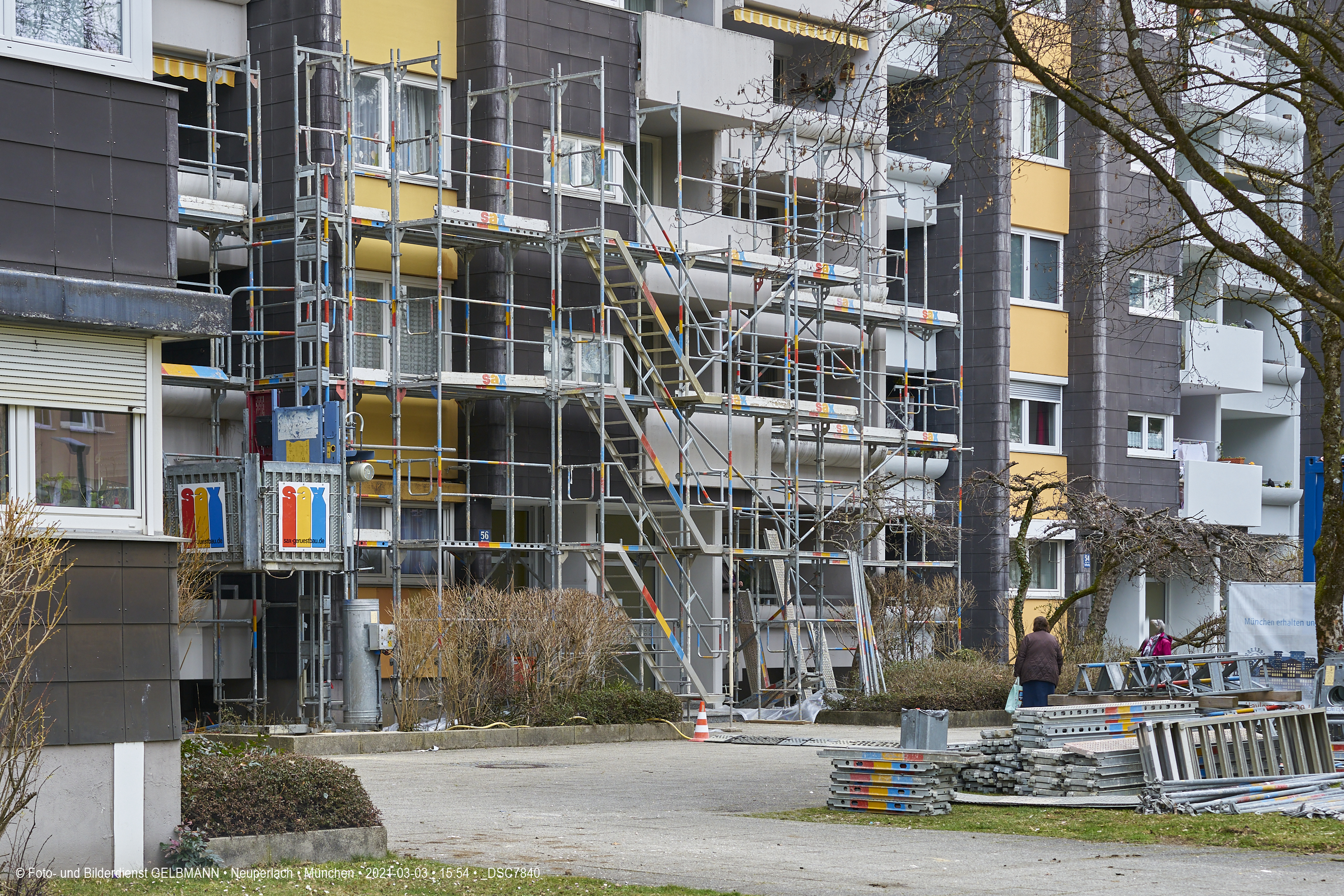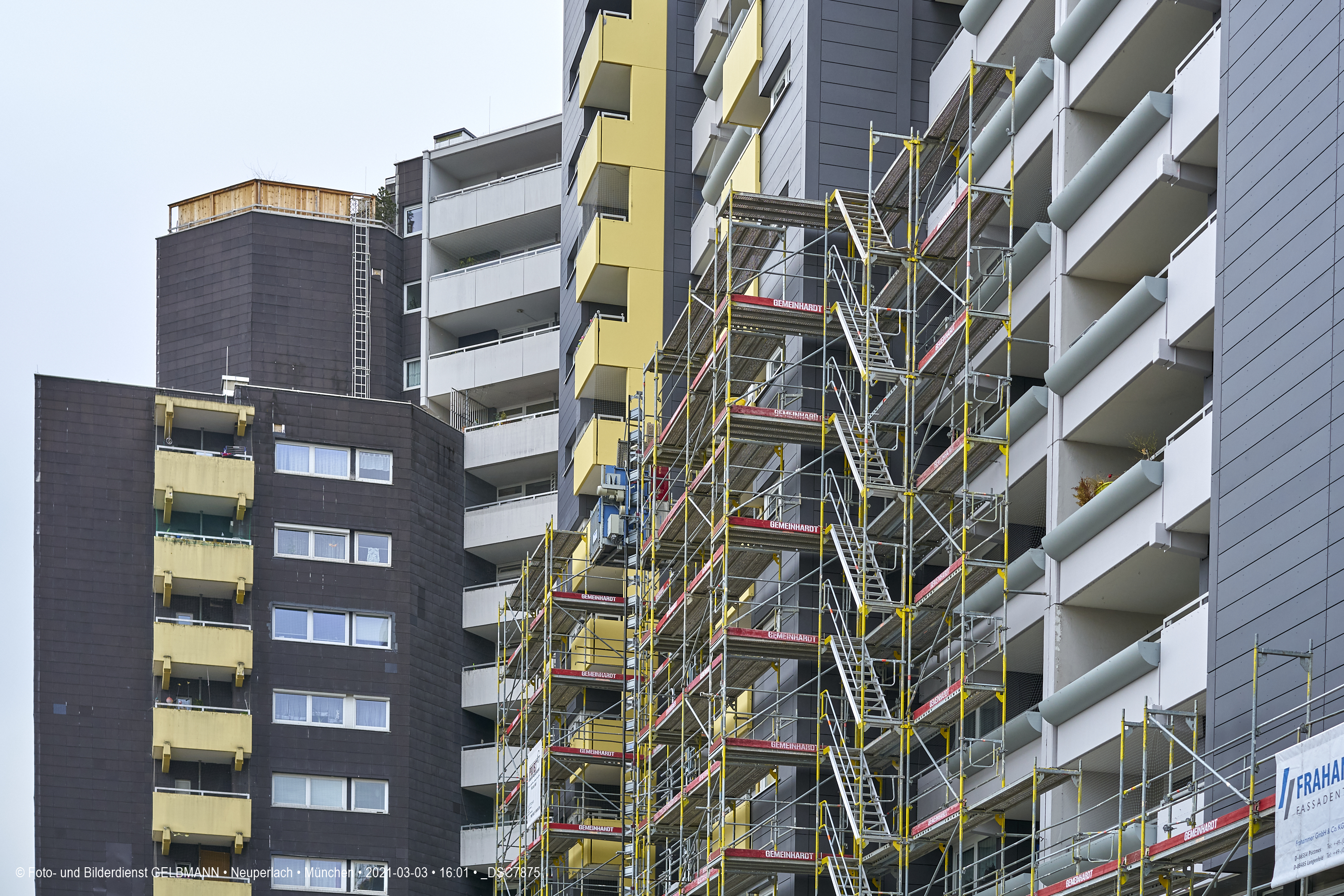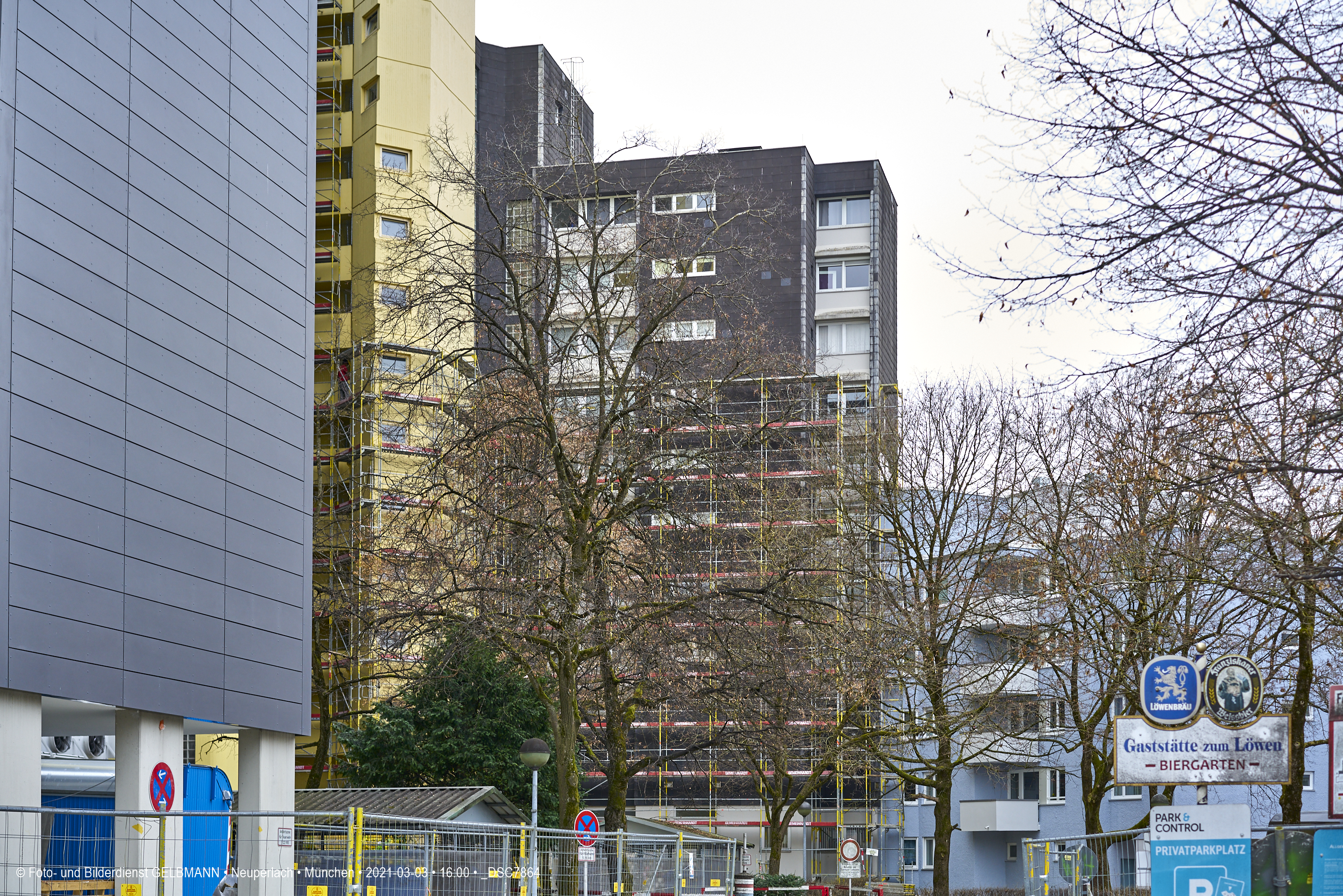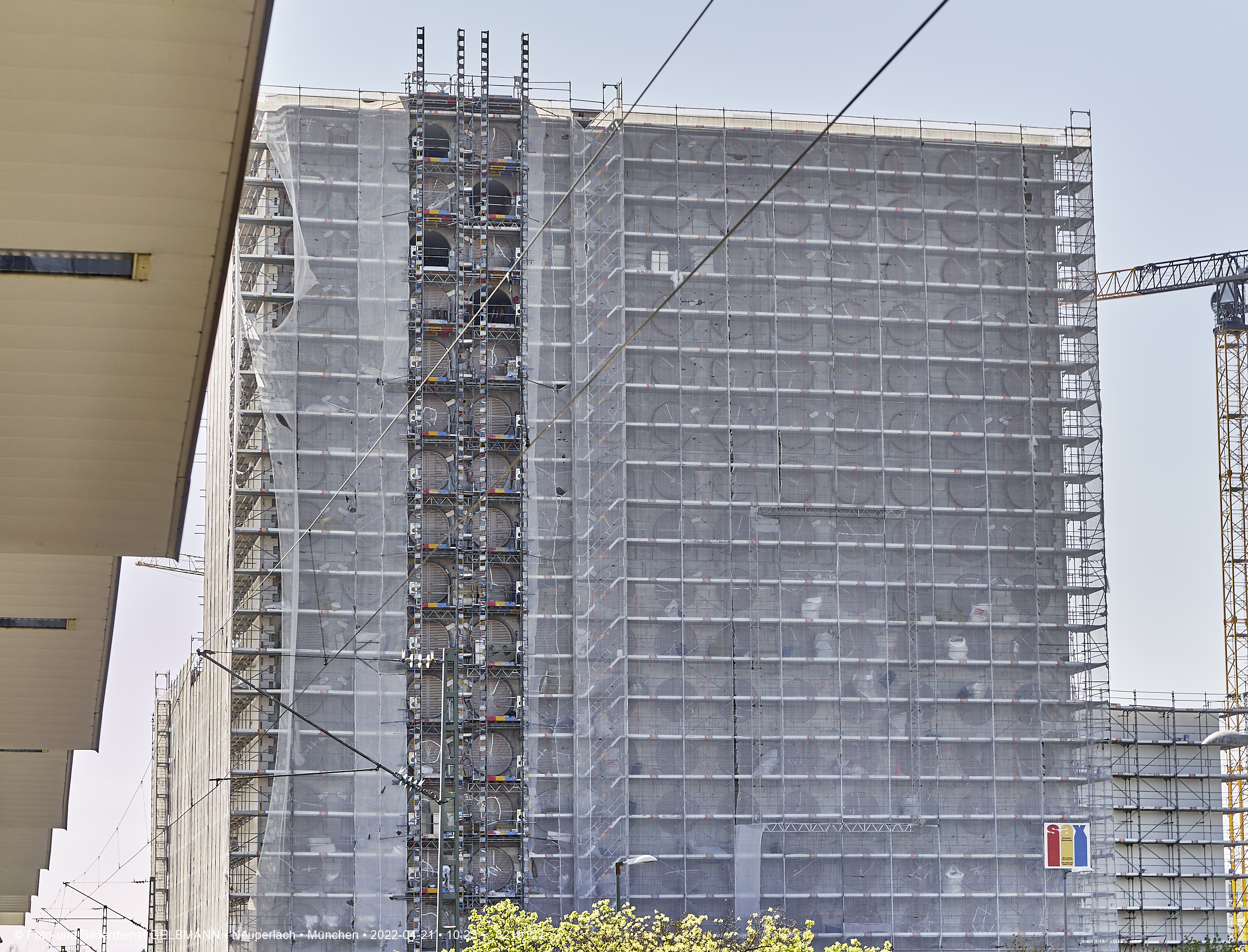Fast wie abgesprochen, aber beide Sanierungen haben nichts miteinander zu tun. Planungen und Sanierungen haben eine lange Vorlaufzeit, die schwer zu koordinieren wäre. Wie verschiedene Wohnanlagen, zwei verschiedene WEG-Verwaltungen, können solche Sanierungen nicht miteinander absprechen und so planen. Am Karl-Marx-Ring 52-62 wurde eine kleine Sanierung, bei mir im Marx-Zentrum, eine sehr große Fassadensanierung mit energetischem Dämmmaterial durchgeführt. Da das Marx-Zentrum so etwas wie die Seele von Neuperlach ist, beteiligt sich auch die Stadt München mit Fördergelder an dieser und auch an den kommenden Sanierungen meiner Burg.