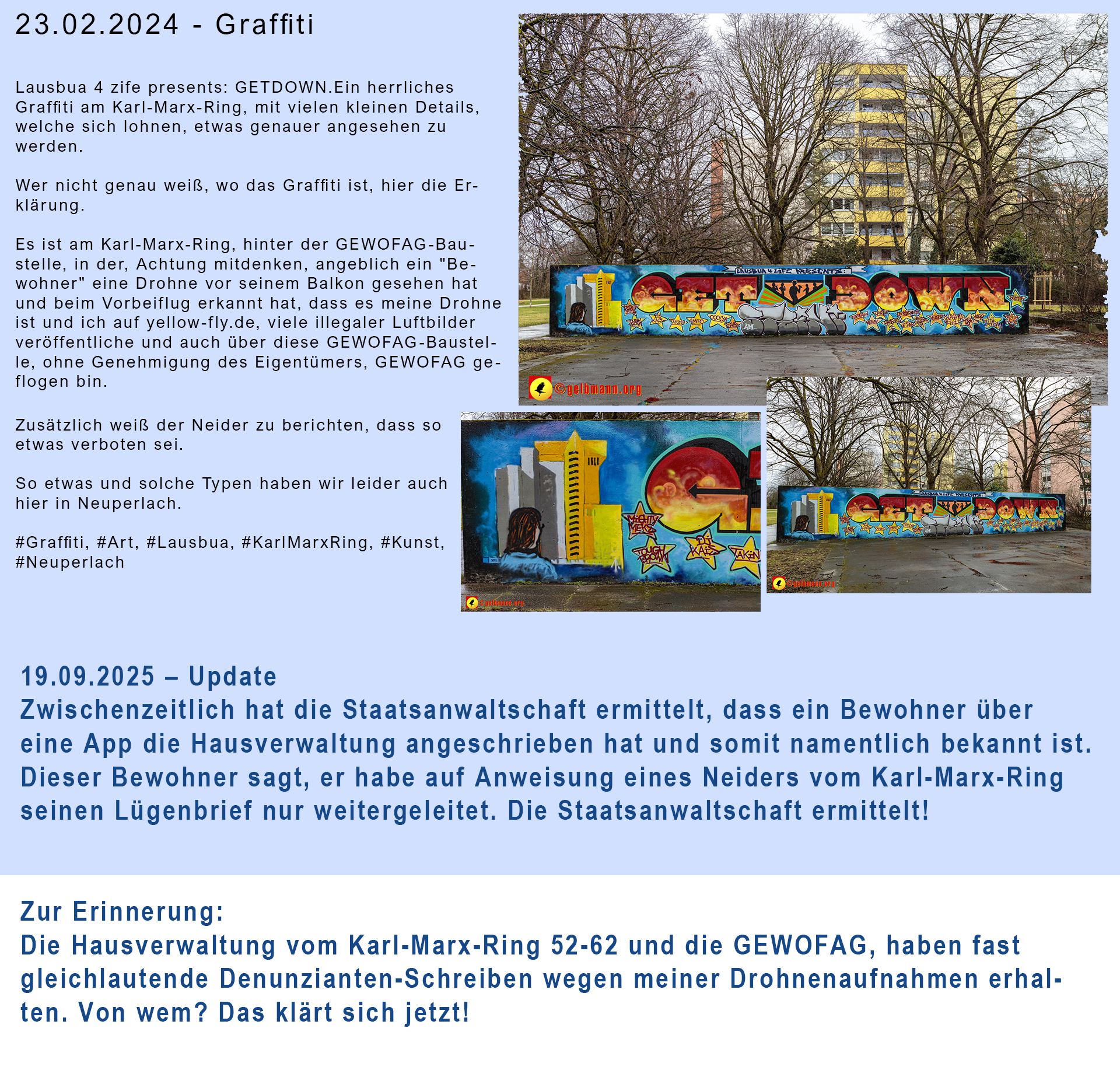 23.02.2024 - Graffiti Lausbua 4 zife presents: GETDOWN.Ein herrliches Graffiti am Karl-Marx-Ring, mit vielen kleinen Details, welche sich lohnen, etwas genauer angesehen zu werden. Wer nicht genau weiß, wo das Graffiti ist, hier die Erklärung. Es ist am Karl-Marx-Ring, hinter der GEWOFAG-Baustelle, in der, Achtung mitdenken, angeblich ein "Bewohner" eine Drohne vor seinem Balkon gesehen hat und beim Vorbeiflug erkannt hat, dass es meine Drohne ist und ich auf yellow-fly.de, viele illegaler Luftbilder veröffentliche und auch über diese GEWOFAG-Baustelle, ohne Genehmigung des Eigentümers, GEWOFAG geflogen bin.