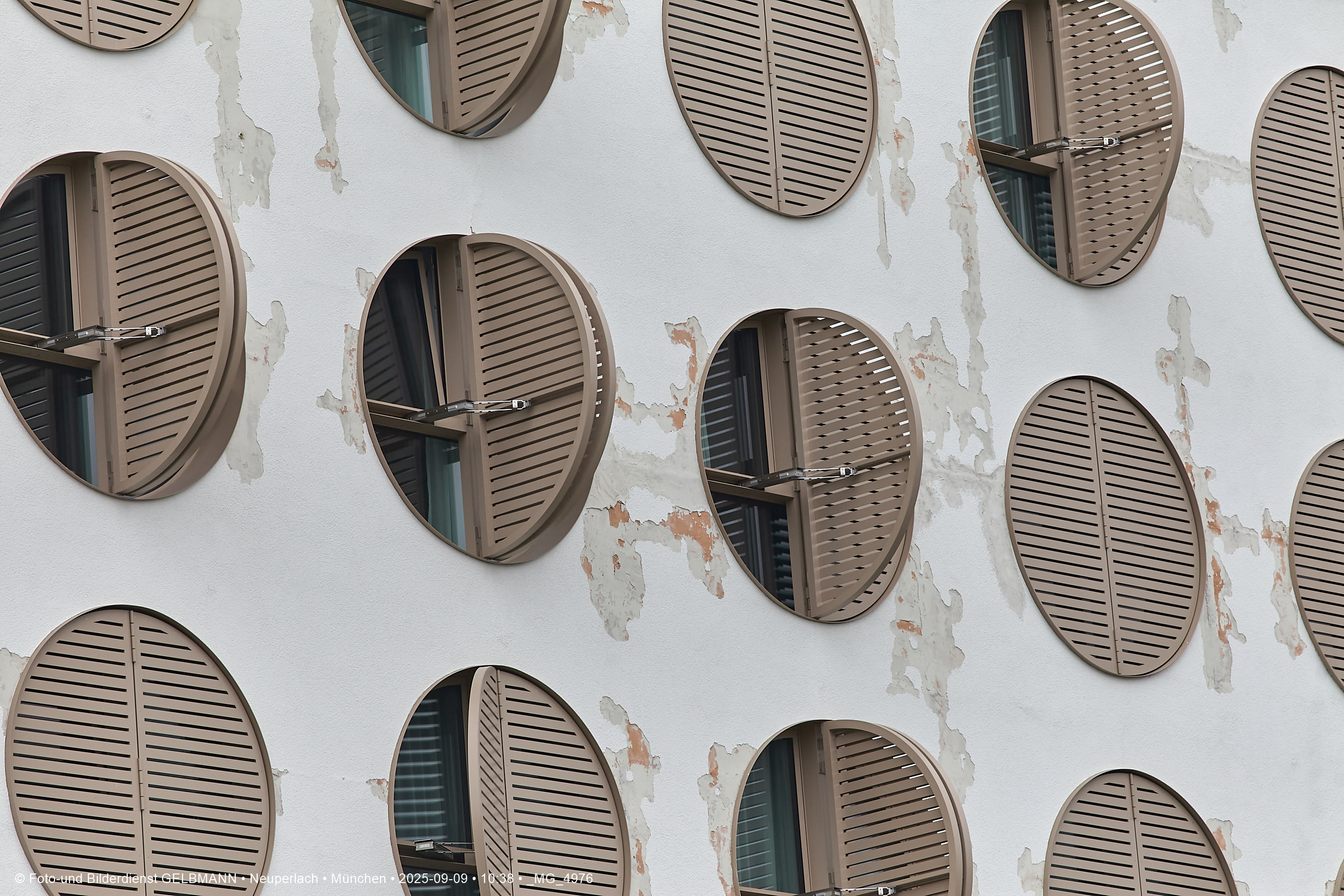 bei der anstehenden Fassadensanierung, andersfarbige, blau war im Gespräch, Fassadenplatten zu verwenden.