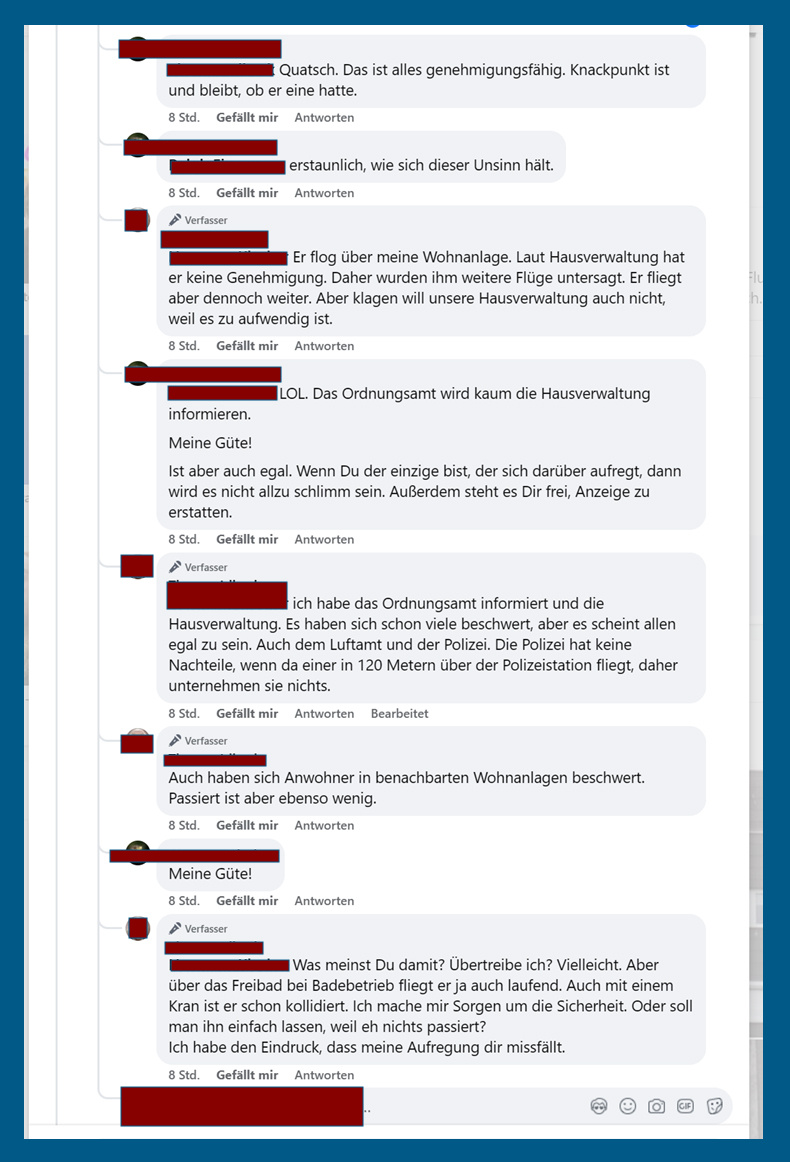 Ein Bewohner, JUDAS 23, berichtet seiner Hausverwaltung, dass ich vor seinem Balkon geflogen sei und auf der Drohne mein Name gestanden habe.