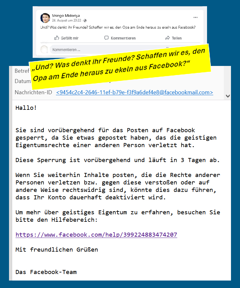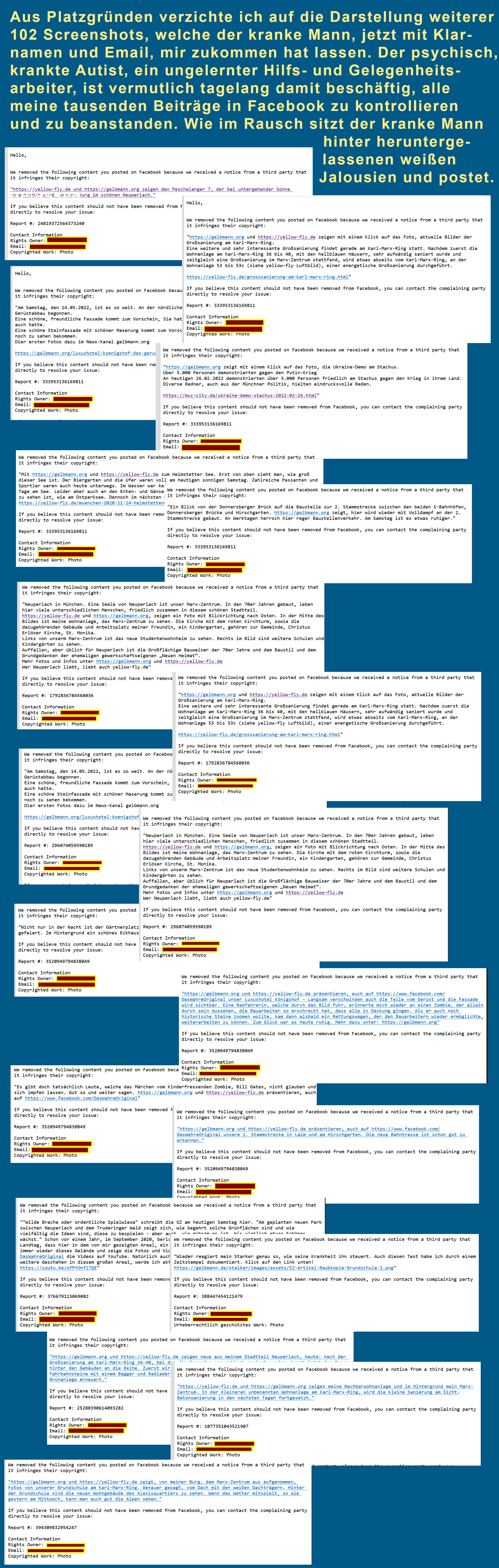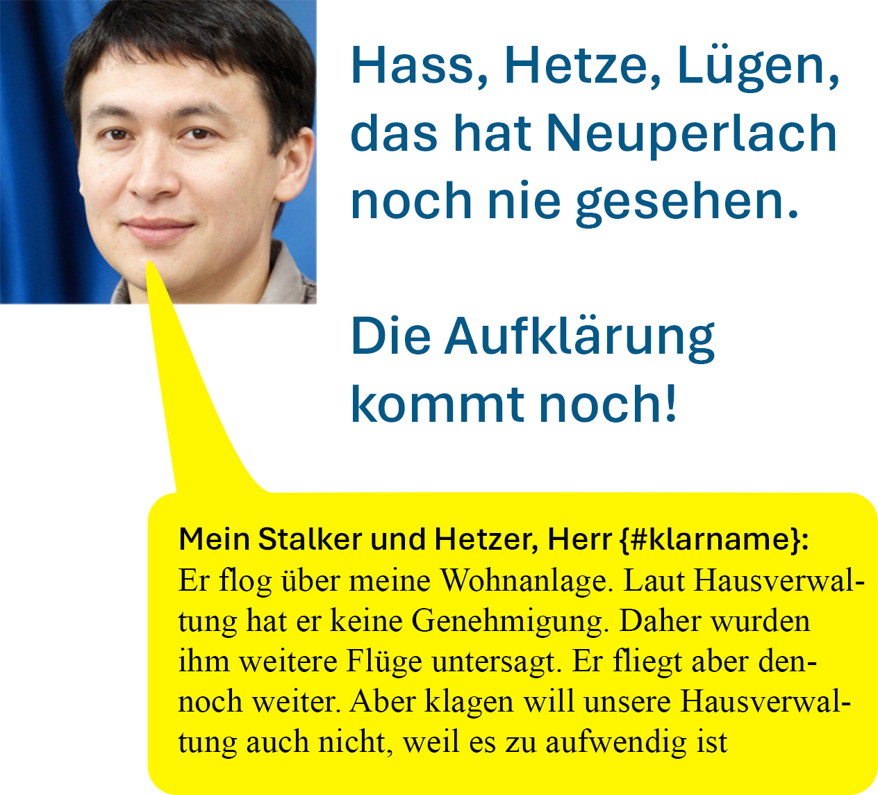 09.09.2025 - trotz Regen, TATORT wird weiter bei uns im Marx-Zentrum gedreht. Das aber tut meinem psychisch kranken Stalker aus der Nachbarwohnanalge sehr weh. Er muss darauf reagieren. Mit seinem Namen, {#klarname}, macht der Saubermann das nicht. Feige und hinterhältig, stalkt der kranke Mann mit diversen Fakeusern.